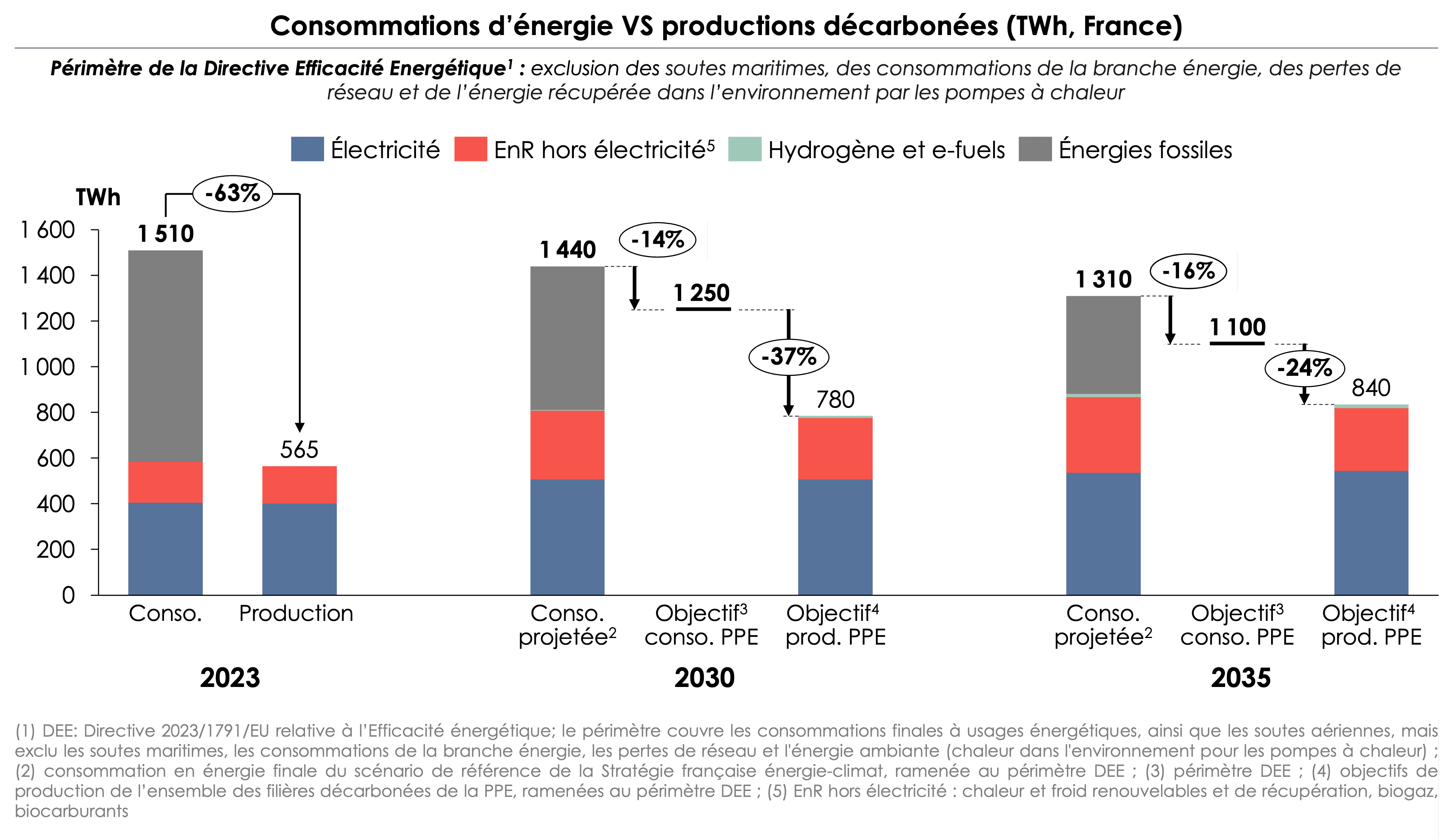 Ces objectifs de production sont ambitieux et souhaitables pour la décarbonation, la souveraineté et la création d’emplois en France. Ils reposent cependant sur une forte évolution de la consommation et donc sur la contraction à marche forcée des filières fioul et gaz.