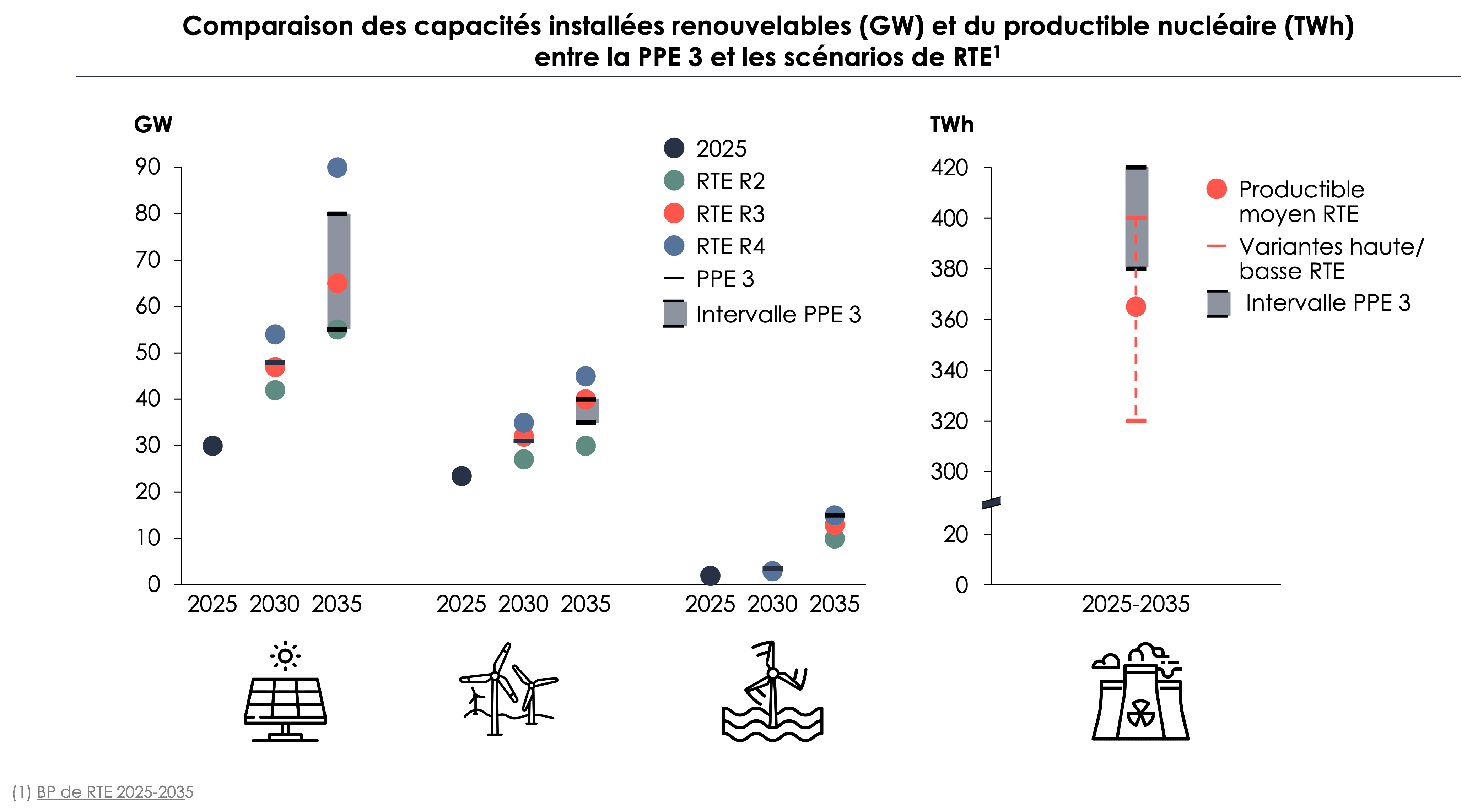La trajectoire affichée par le scénario central de la PPE3 confirme le développement important des filières renouvelables électriques (avec des objectifs proches des scénarios de développement élevés de RTE[5]). Simultanément, les objectifs pour les 10 prochaines années sont très optimistes pour la filière nucléaire avec :