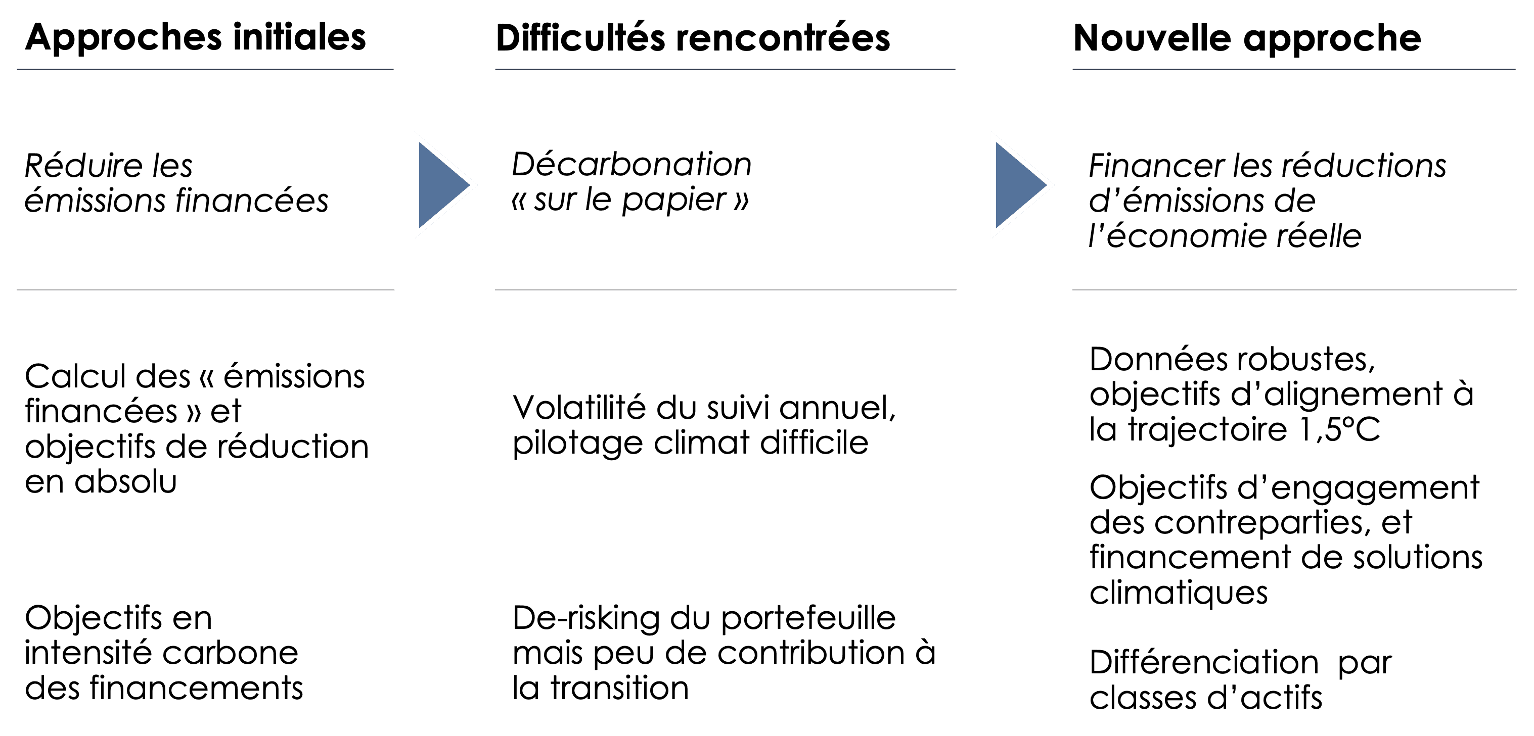 Ce nouveau risque de crédibilité et les réformes des labels mettent en lumière la mutation récente des approches de la finance climat. La première vague d’initiatives s’est concentrée sur la baisse des « émissions financées » au niveau des portefeuilles, via des objectifs en émissions absolues ou en intensité et des arbitrages d’allocation. Cette logique a permis de structurer le sujet, mais elle a parfois abouti à une décarbonation principalement comptable ou dite « sur le papier ».