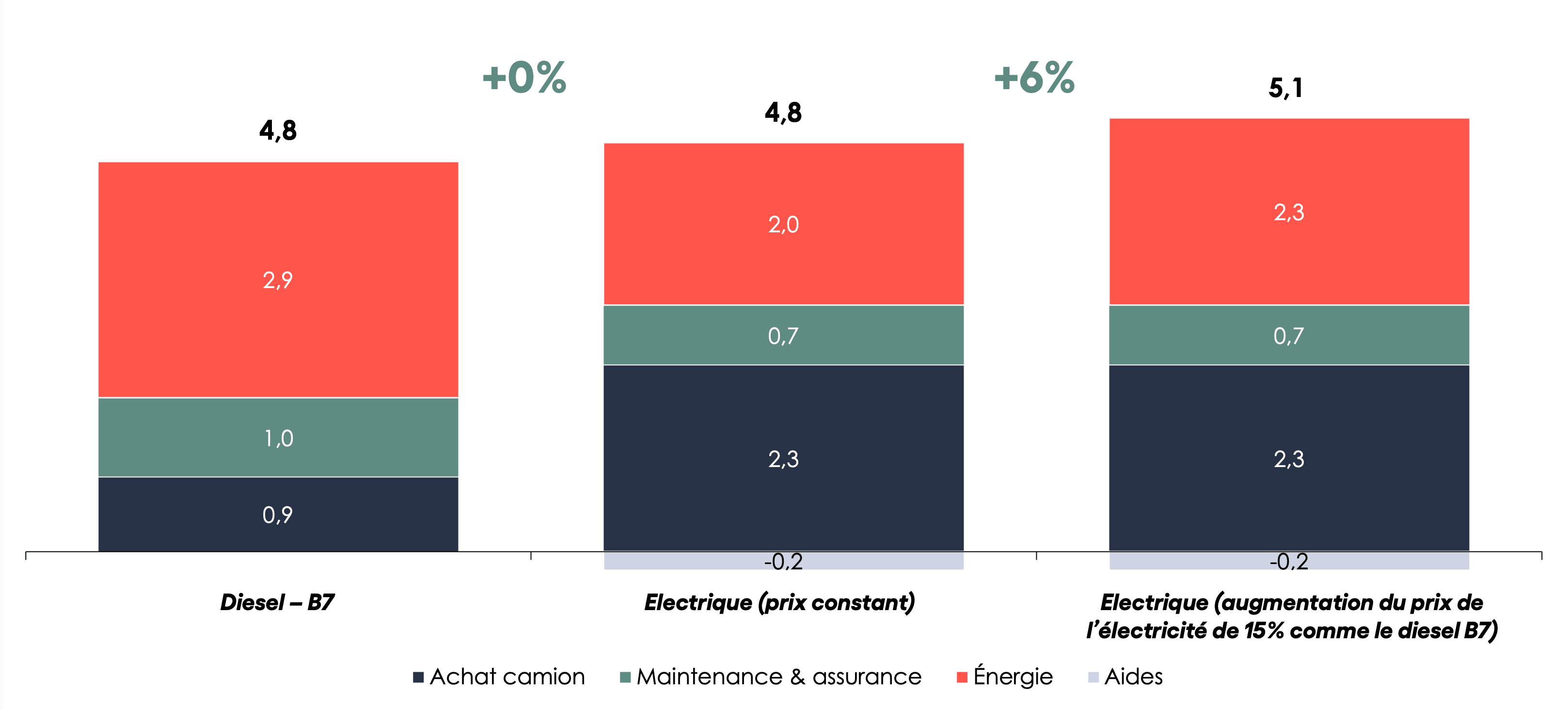 Les différences de coûts TCO entre un tracteur routier de 44t diesel (B7) et un tracteur électrique varient beaucoup selon les situations, mais prenons par exemple un surcoût de 10% du TCO électrique avant le début de la guerre. Aujourd’hui, l’écart entre les deux motorisations se réduit à 6 %, en supposant une augmentation équivalente (+15%) des prix du diesel et de l’électricité. Avec l’hypothèse d’un prix de l’électricité stable (par exemple, en cas d’autoconsommation ou de contrats PPA), le TCO peut même atteindre la parité.