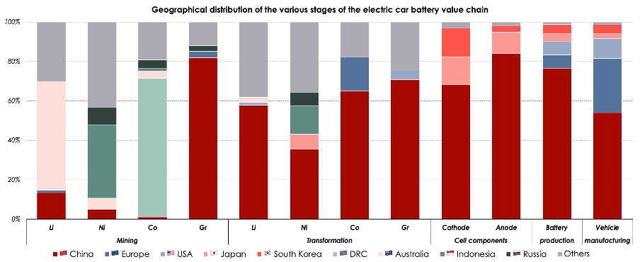 Geographical distribution of the various stages of the electric car battery value chain