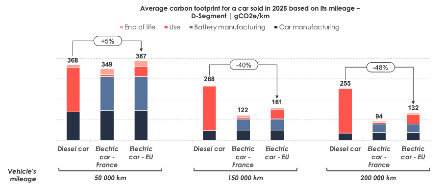 Average carbon footprint of a car sold in France in 2025 – D-Segment – 200,000 km | gCO2e/km