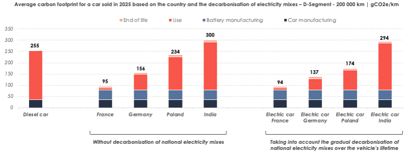Average carbon footprint for a car sold in 2025, depending on the country and the decarbonisation of the electricity mixes – D-Segment – 200,000 km | gCO2e/km