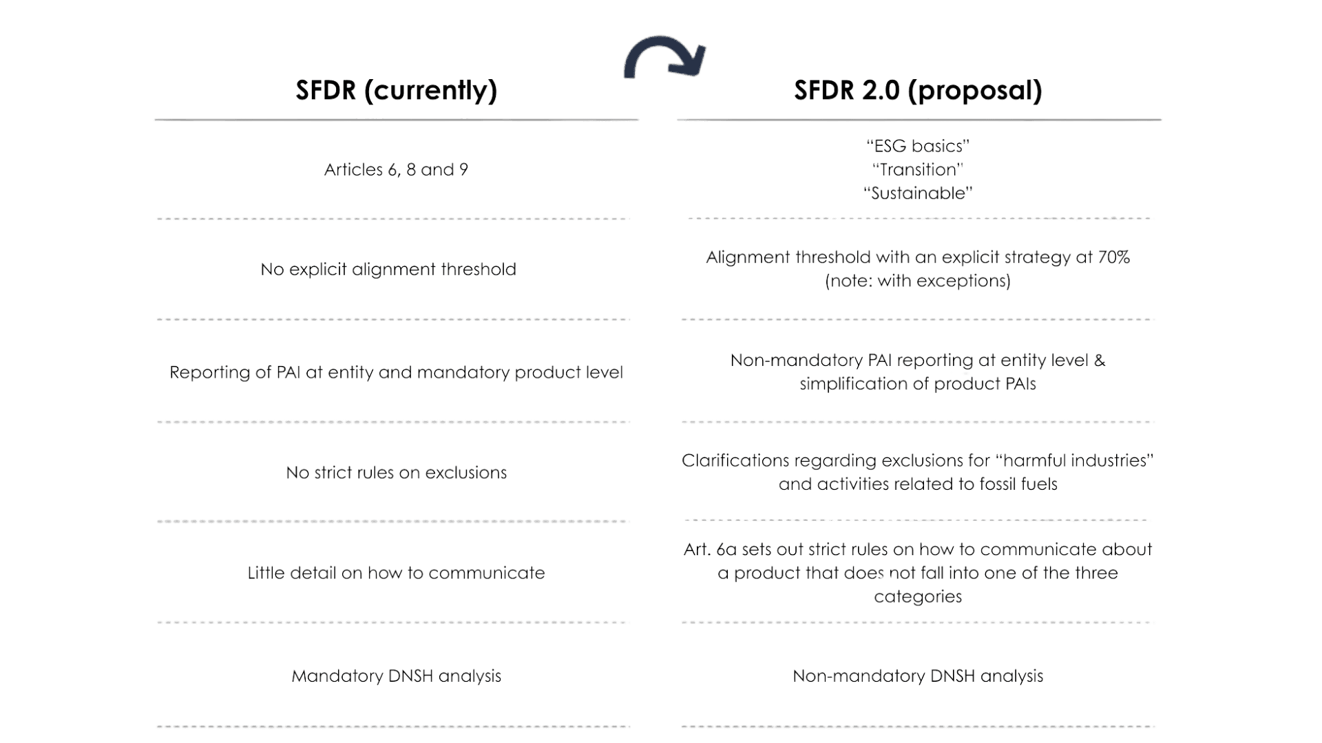 SFDR 2.0 proposes a number of changes with the stated aim of making the regulation more readable and less costly for financial players: "simplify and reduce the sustainability-related administrative and disclosure requirements” as well as “improve end-investors’ ability to understand and compare sustainability-linked financial products".