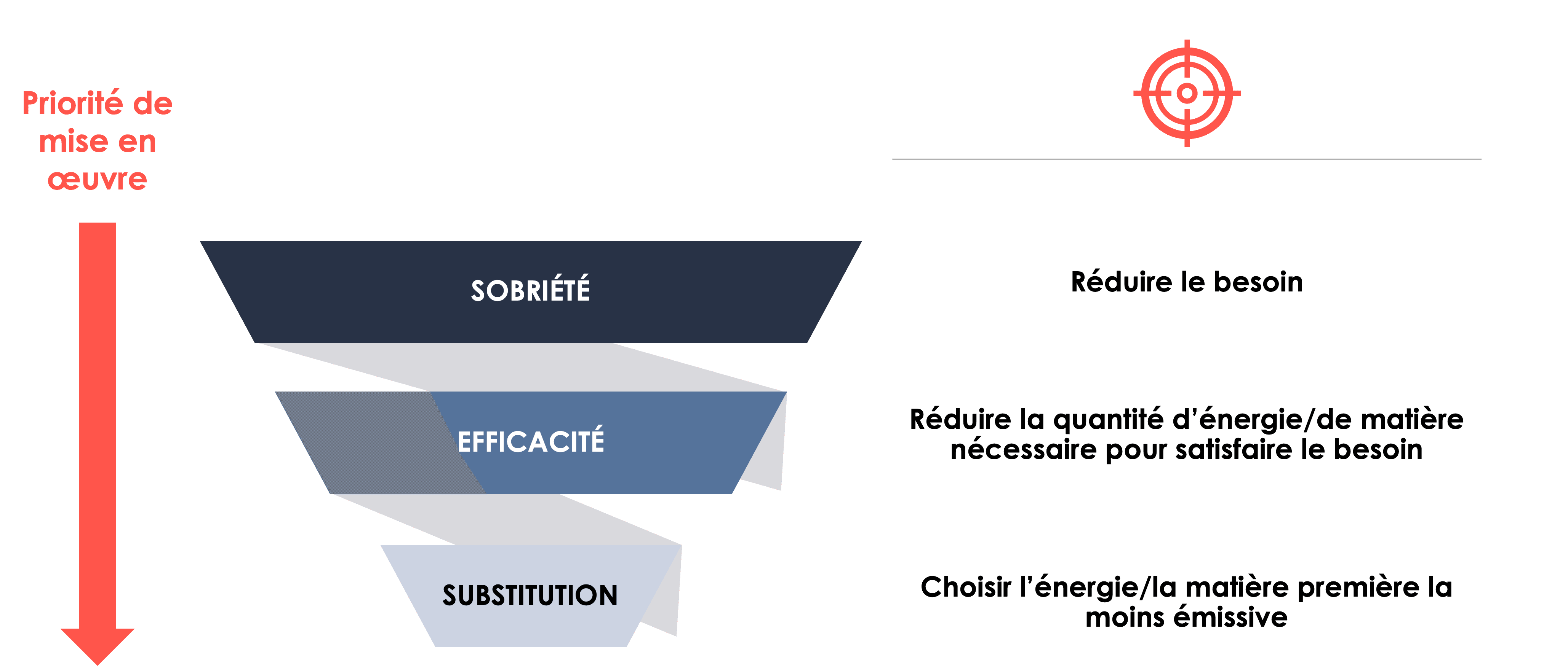 Les leviers de réduction peuvent se décliner en trois grandes catégories : sobriété, efficacité et substitution décrites ci-dessous.