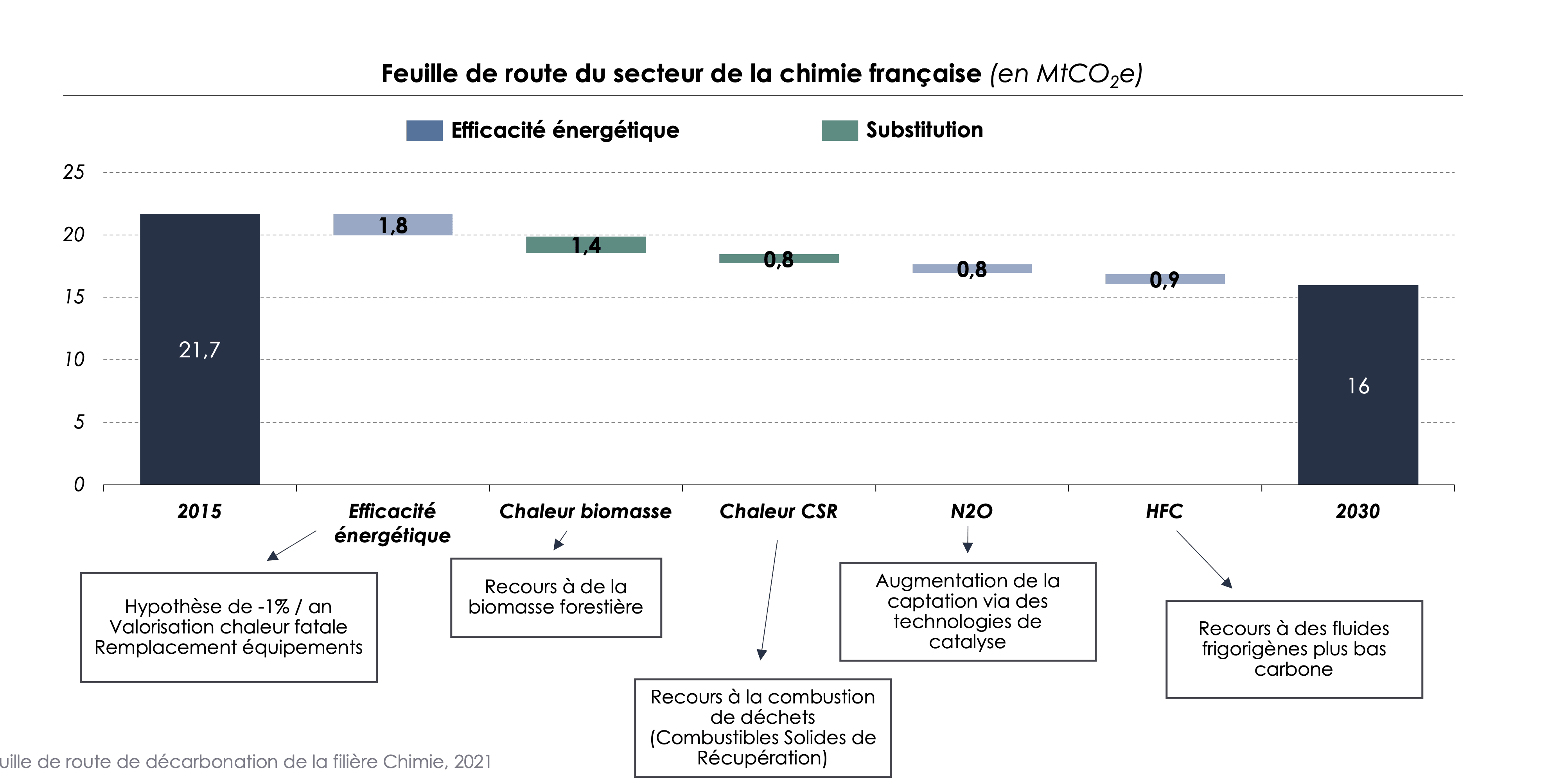 Le secteur de la chimie française a recensé l’ensemble des pistes de réduction de la filière, qui peuvent s’appliquer aux industriels producteurs d’engrais, dans une feuille de route publiée en 2021[8]. Cette feuille de route décrit les leviers de réduction des émissions ayant lieu dans les usines de production d’engrais, que ce soient les émissions associées à l’énergie utilisée pour les mélanges ou les émissions directes issues des réactions chimiques. Ce document décrit des leviers d’efficacité énergétique (la modernisation des équipements industriels, l’optimisation des procédés ou la récupération de chaleur fatale), des leviers d’efficacité pour réduire les émissions fugitives (le développement de technologies de catalyse réduisant les émissions de protoxyde d'azote lors de la fabrication d’acide nitrique, etc.), ainsi que des leviers de substitution (exemple: la chaleur issue de la biomasse forestière[9], etc.) ou de la combustion de déchets. Au total, une réduction potentielle de 26% est estimée à horizon 2030 alors que la SNBC 3 vise une réduction de 46% pour le secteur industriel à horizon 2030 (cf figure 2).