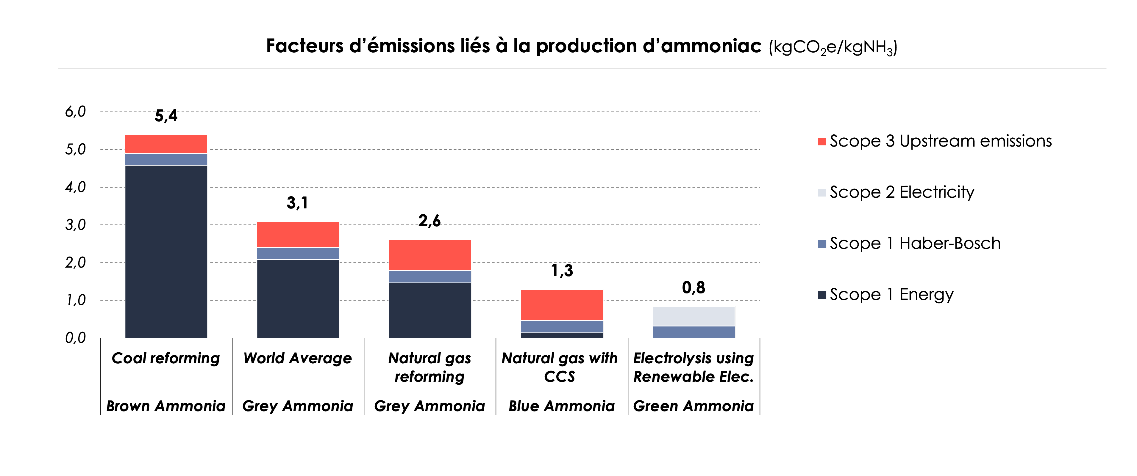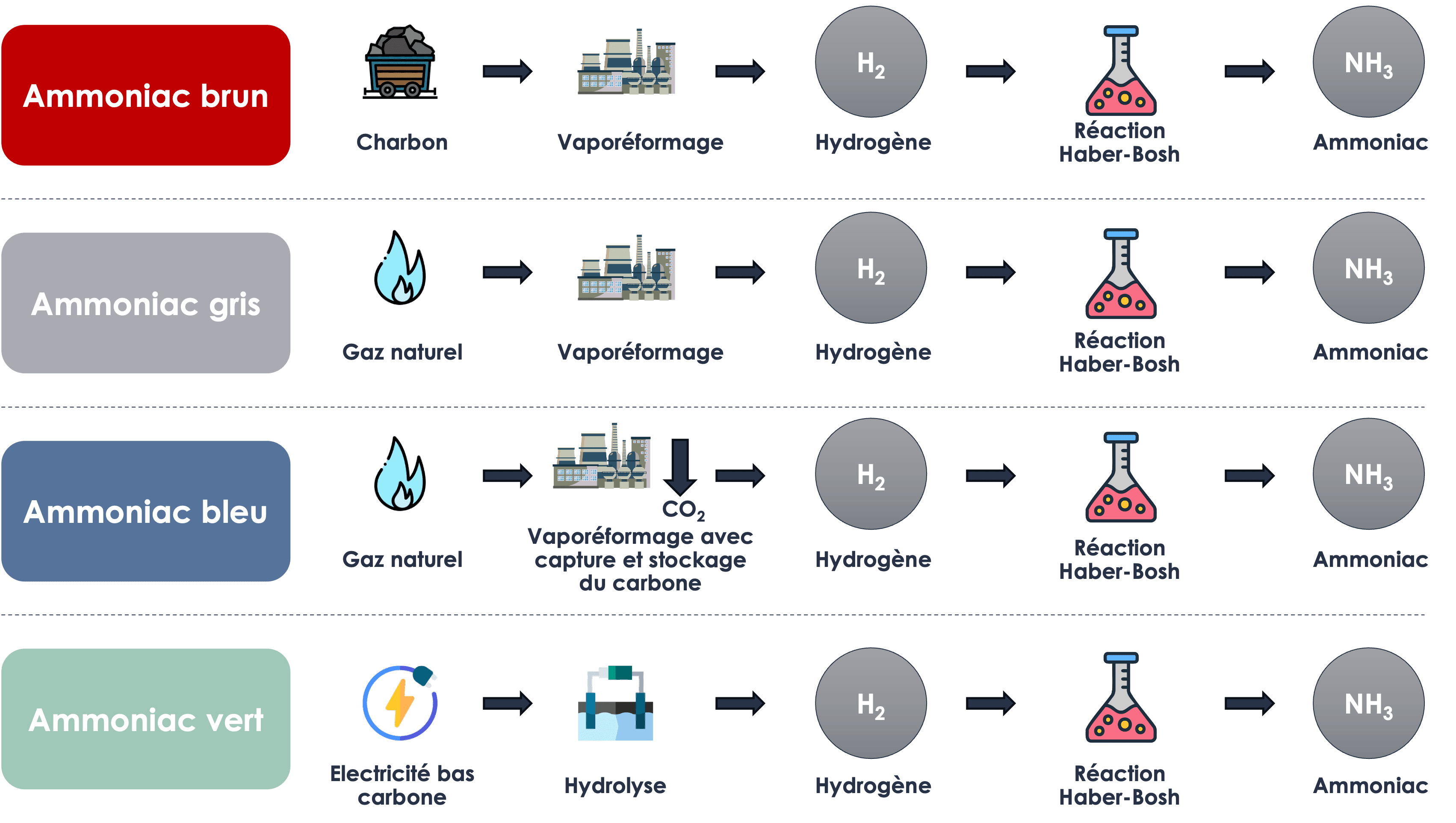 - L’ammoniac gris fait référence à de l’ammoniac produit à partir d’hydrogène, issu du vaporeformage de gaz naturel ;